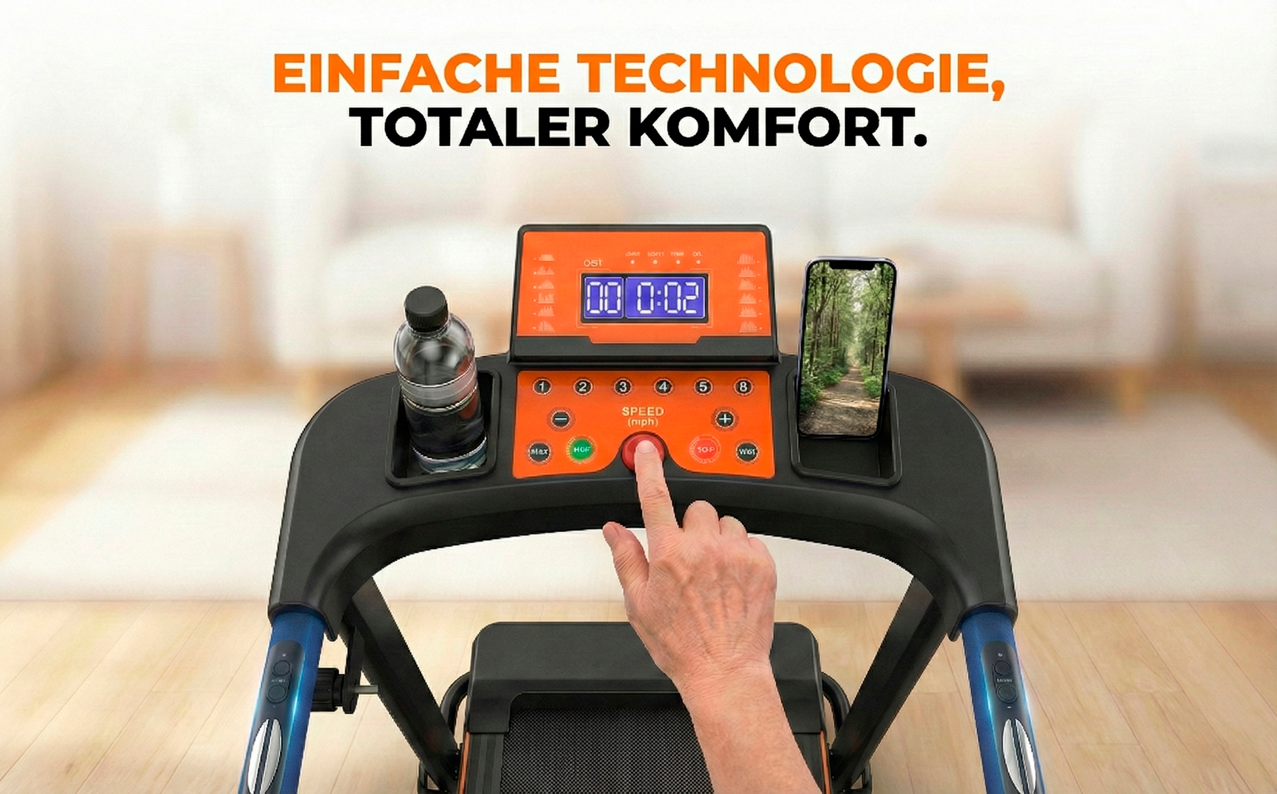 Technologie soll helfen, nicht verwirren. Der LED-Bildschirm des S200 zeichnet sich durch große Zahlen und hohen Kontrast aus, sodass Geschwindigkeit, Distanz, Zeit und Kalorien auf einen Blick ablesbar sind. Zudem ermöglichen die im Handlauf integrierten Pulssensoren die Überwachung Ihrer Herzfrequenz in Echtzeit, ganz ohne Brustgurt.
