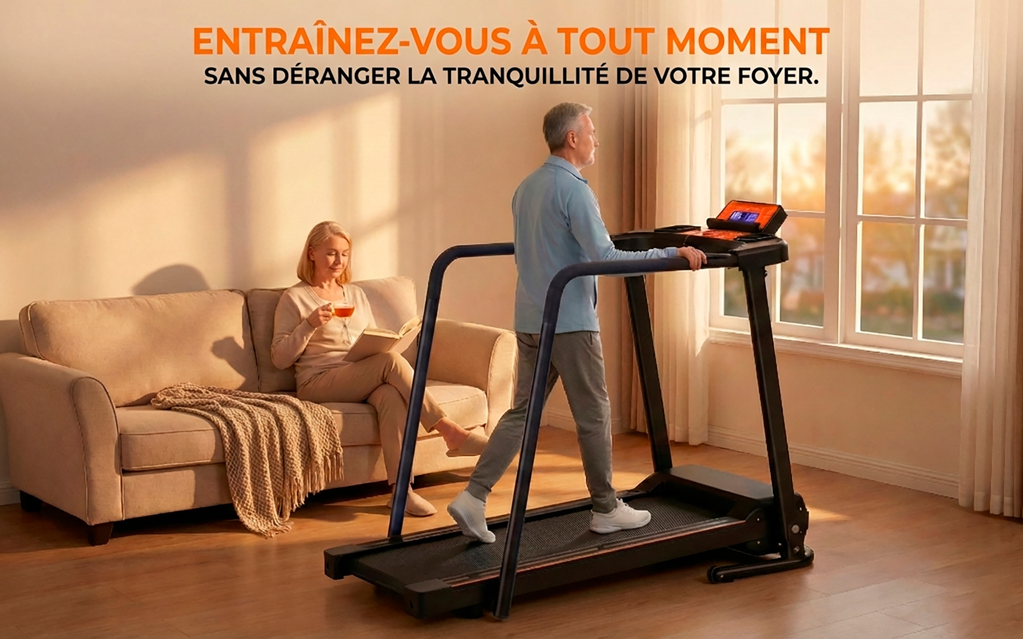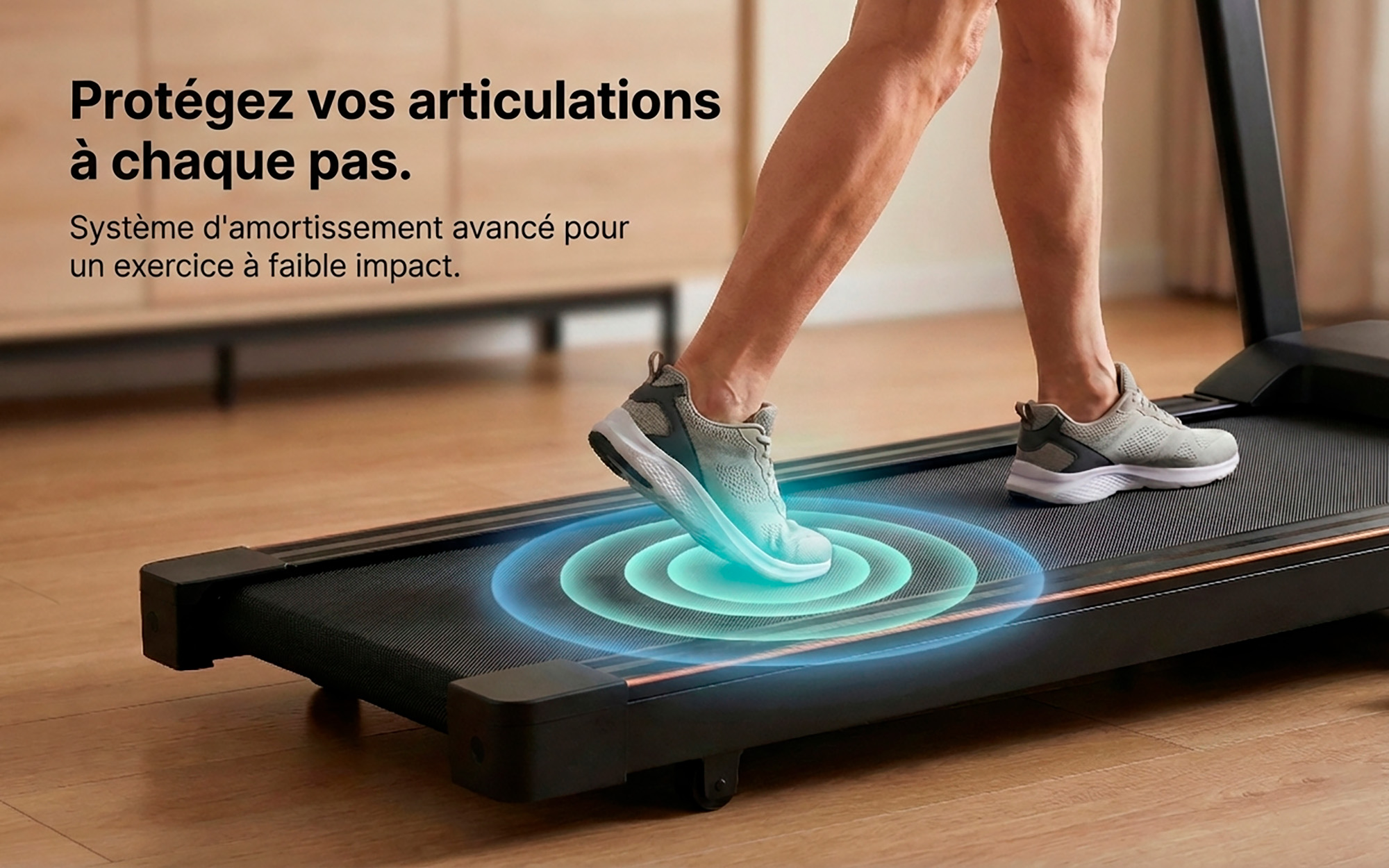Prendre soin de vos genoux est notre priorité. La surface de course du S200 est dotée d'une technologie multicouche antidérapante et d'un système d'absorption des chocs. Cela signifie que chaque pas est amorti, réduisant considérablement la pression sur les chevilles, les genoux et les hanches par rapport à la marche sur l'asphalte.