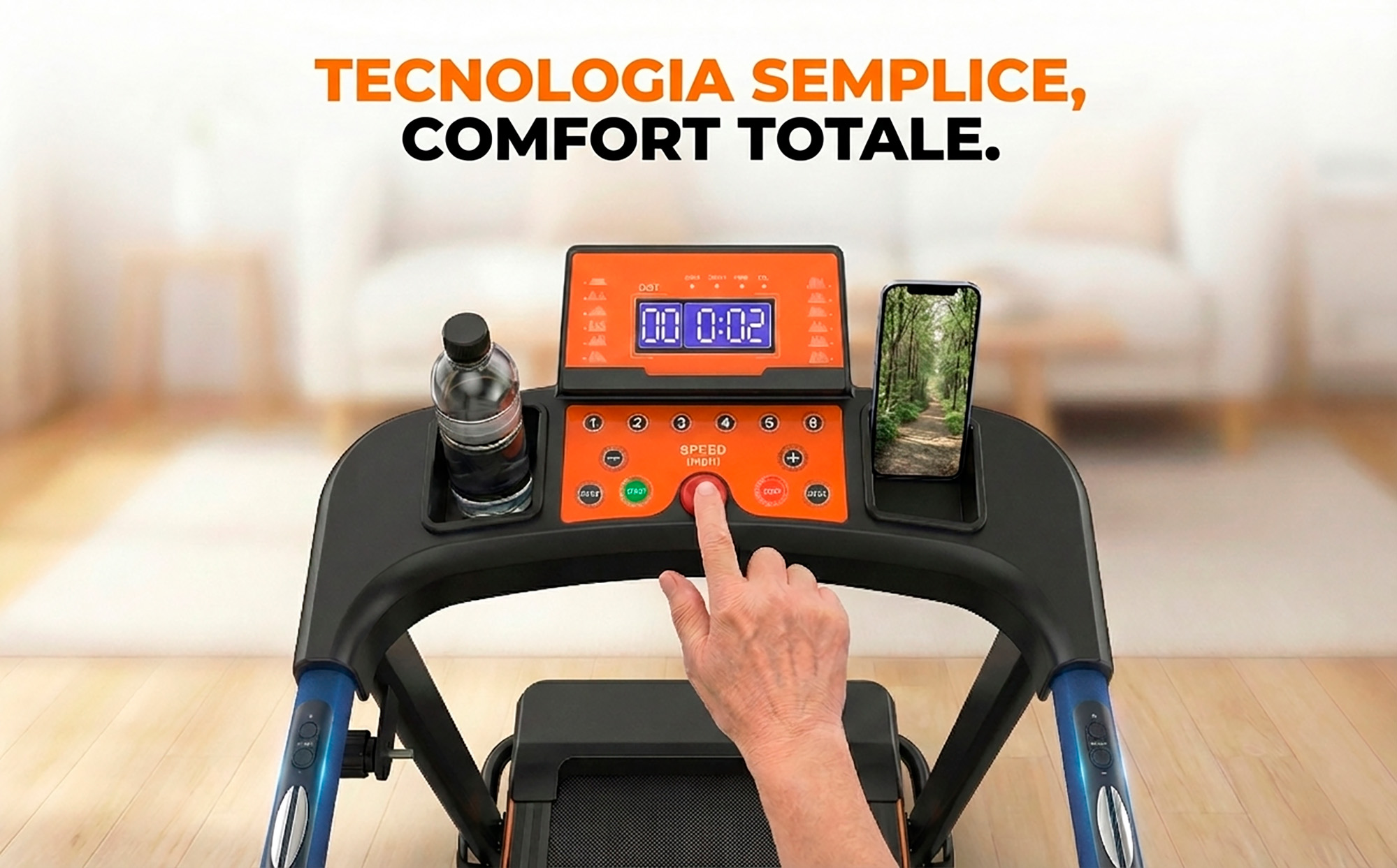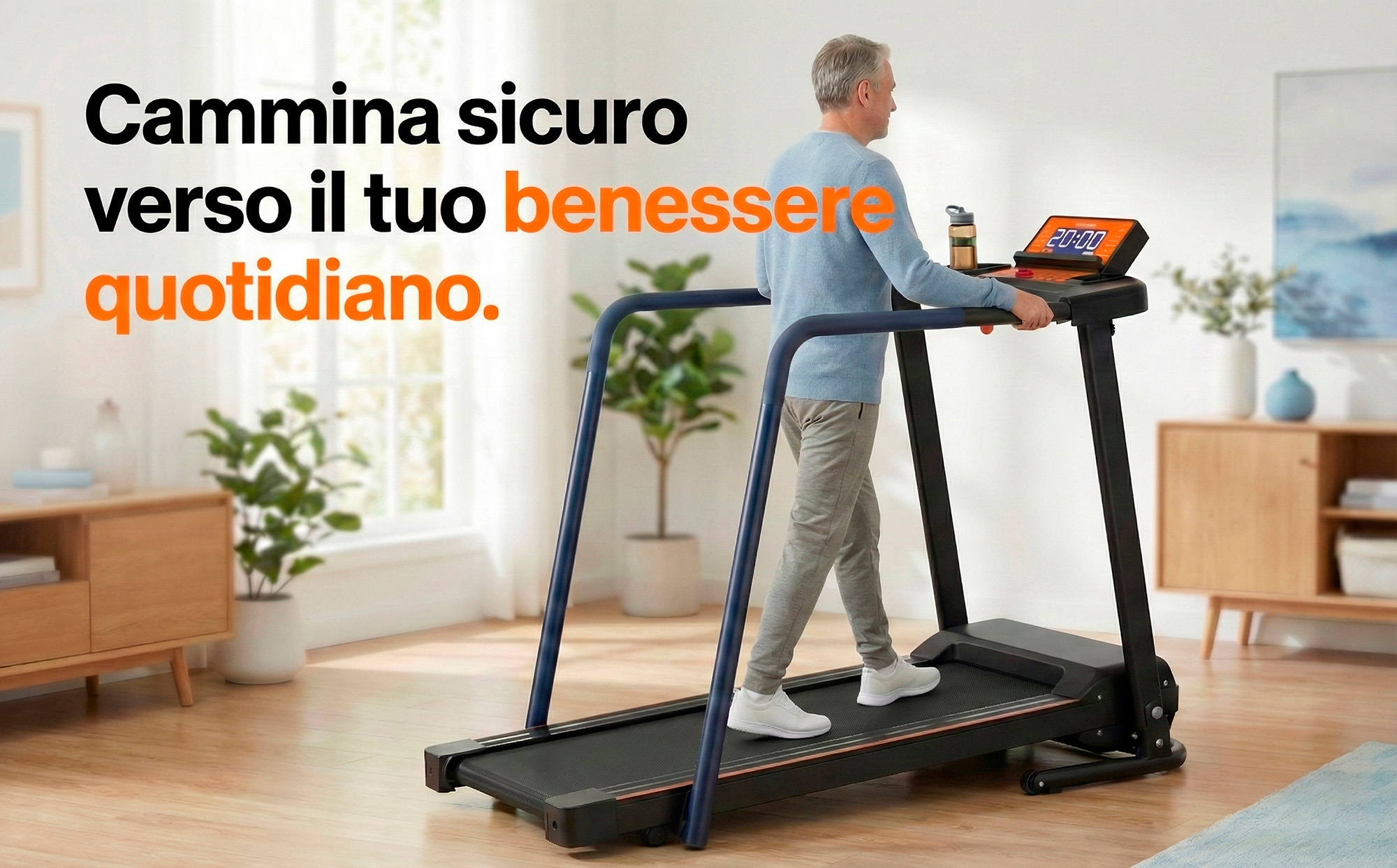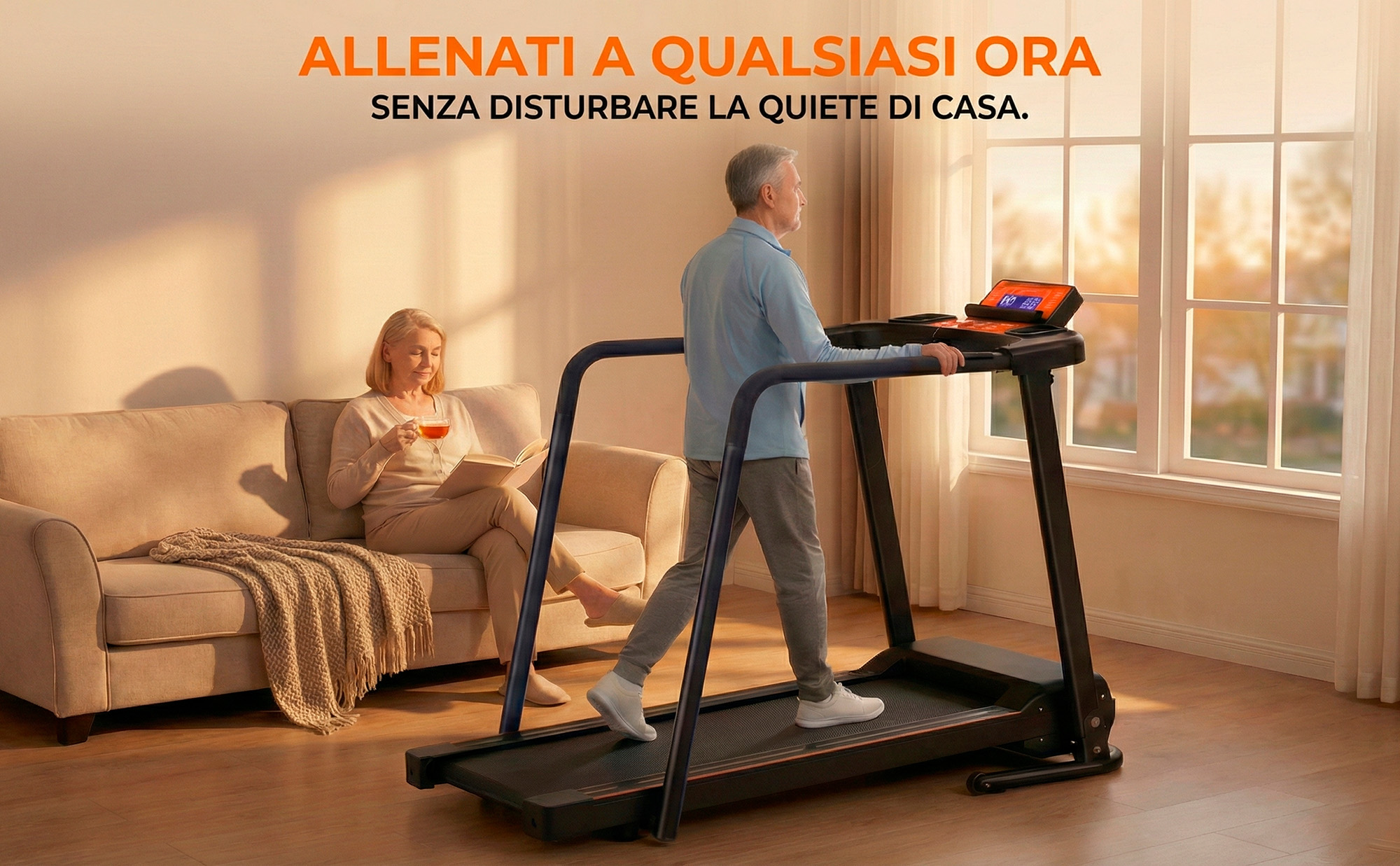 Proteggere le tue ginocchia è la nostra priorità. La superficie di corsa dell'S200 è dotata di una tecnologia multistrato antiscivolo e di un sistema di assorbimento degli urti. Questo significa che ogni passo è ammortizzato, riducendo drasticamente la pressione su caviglie, ginocchia e anche rispetto alla camminata su asfalto.