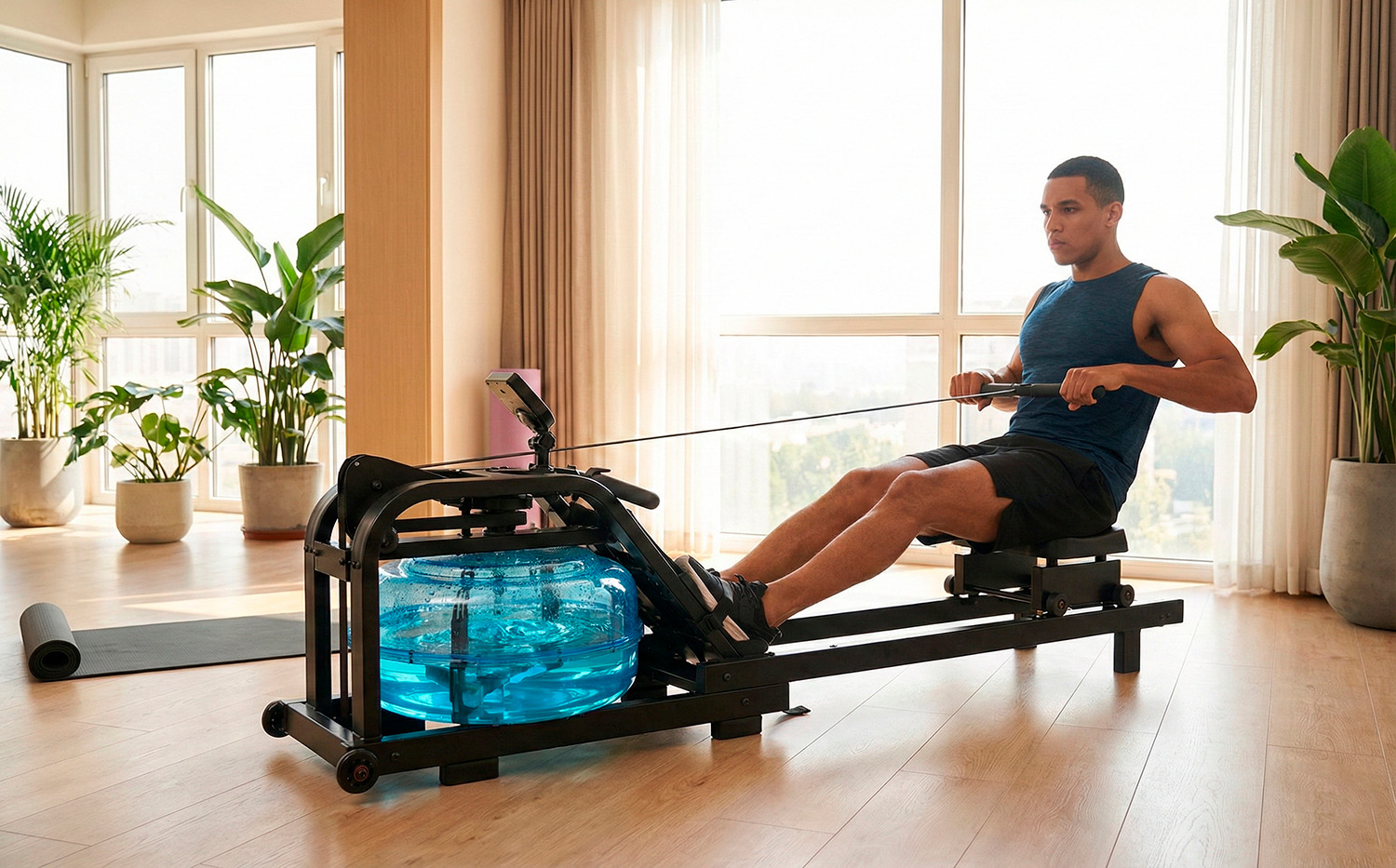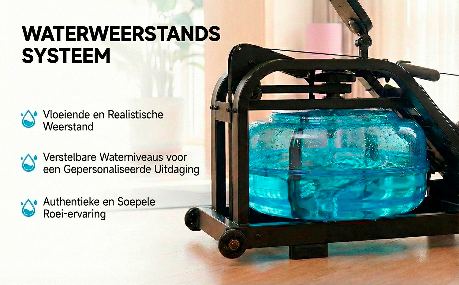 Het ontwerp is opgebouwd uit een robuust stalen frame met een hoogwaardige laklaag, wat zorgt voor een unieke en nooit eerder geziene structuur en maakt deze waterroeier tot de perfecte combinatie van vorm en functie, die een ideale aanvulling vormt voor elke locatie, thuis of professionele sportschool.