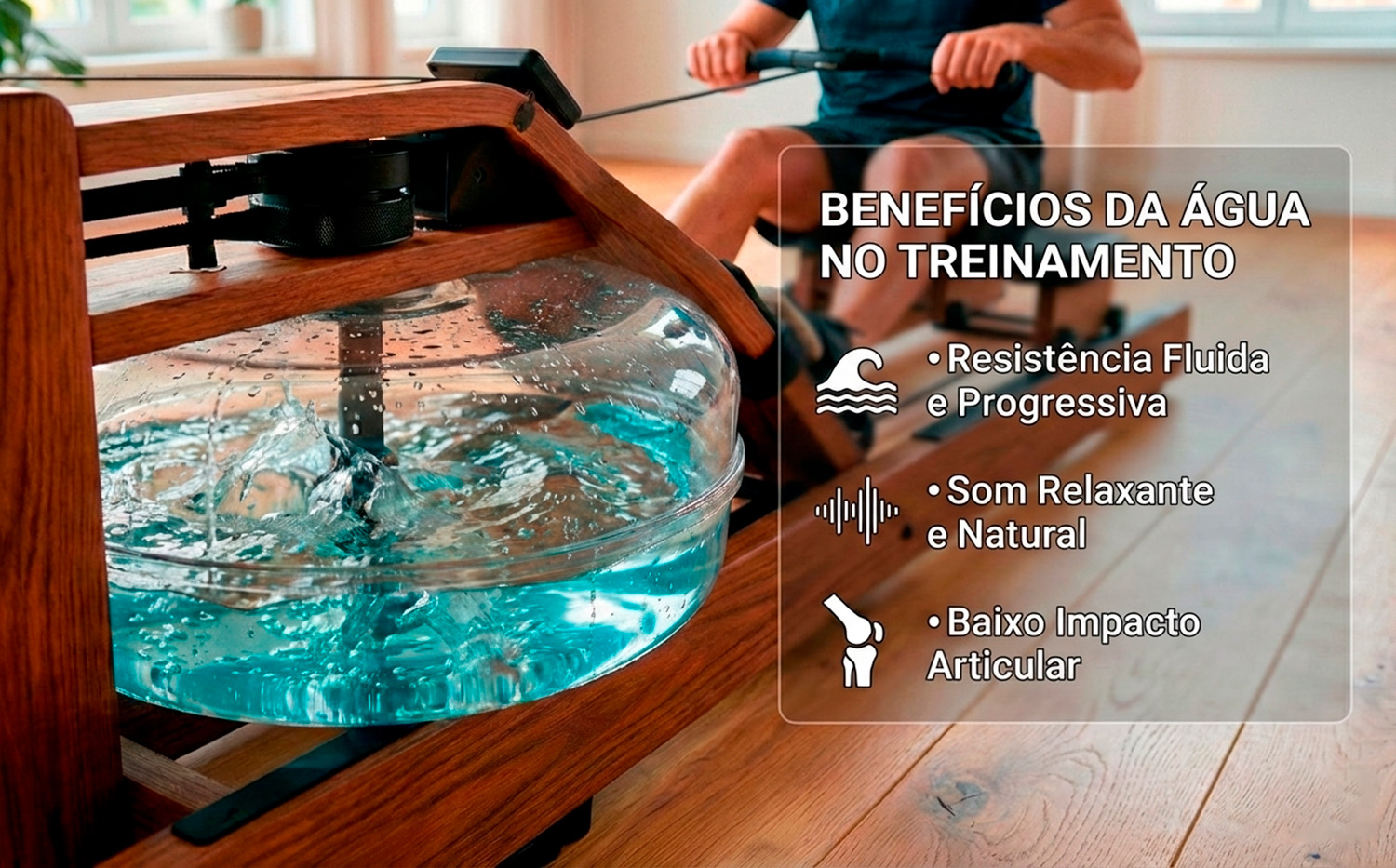 Sensação Real de Remo: O tanque de 14L cria uma resistência dinâmica e um som relaxante de água. Você define a intensidade: quanto mais força, maior a resistência.