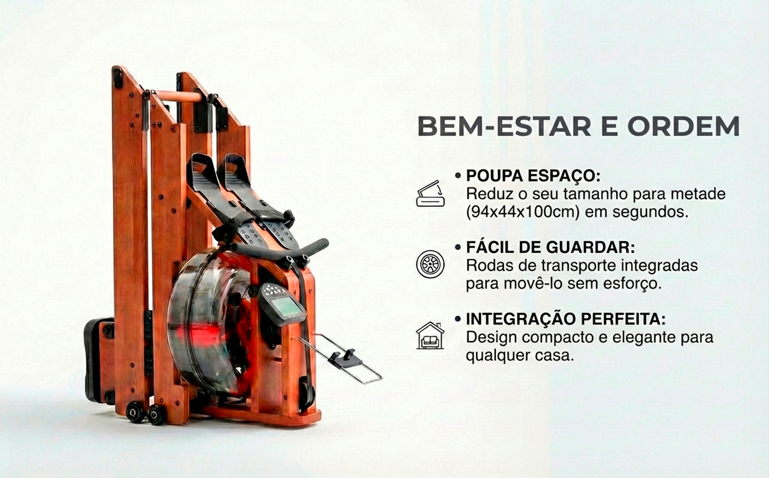 Design Ultra-Compacto: Ideal para apartamentos. O seu sistema dobrável de 180° reduz o equipamento para apenas 94cm de comprimento, permitindo arrumação fácil e rápida.